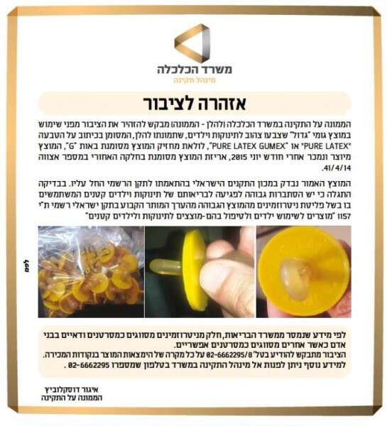 משרד הכלכלה מזהיר משימוש במוצצי גומי של חברת GUMEX, בשל חשש מהימצאותם של חומרים מסרטנים בהם. המשרד מדגיש כי מדובר במוצצים בגודל "גדול" בצבע צהוב, המסומן בכיתוב על הטבעת "PURE LATEX" או "PURE LATEX GUMEX". סימנים נוספים מזהים של המוצצים הם לולאת מחזיק המוצץ מסומנת באות G, תאריך ייצור ומכירה אחרי חודש יוני 2015 ומספר האצווה המסומן על חלקה האחורי של אריזת המוצצים הוא 41/4/14.