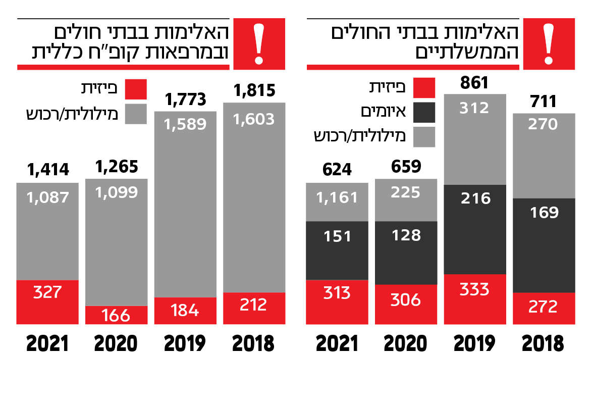 נתונים מבישים אלו עולים מדו"ח של מרכז המחקר והמידע של הכנסת, שבחן את הטיפול של משרד הבריאות בנושא האלימות במערכת הבריאות. מדובר בנתונים חלקיים שלא מקיפים את כלל המערכת.