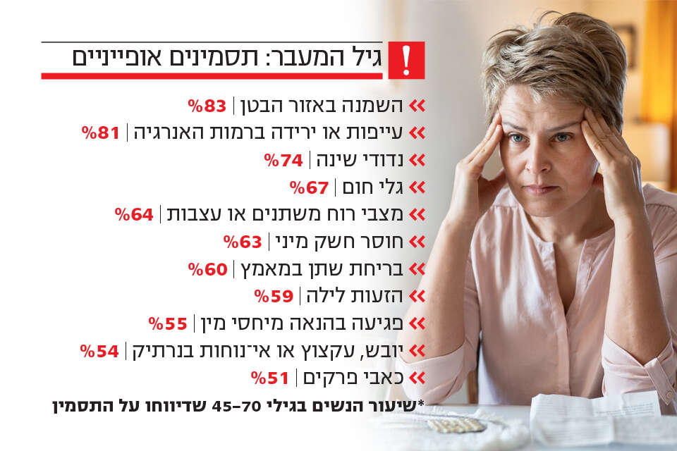 מרבית הנשים בארץ סובלות מתסמיני גיל המעבר בלי לקבל טיפול רפואי לתסמינים - כך עולה מסקר חדש שערכה האגודה הישראלית לגיל המעבר.