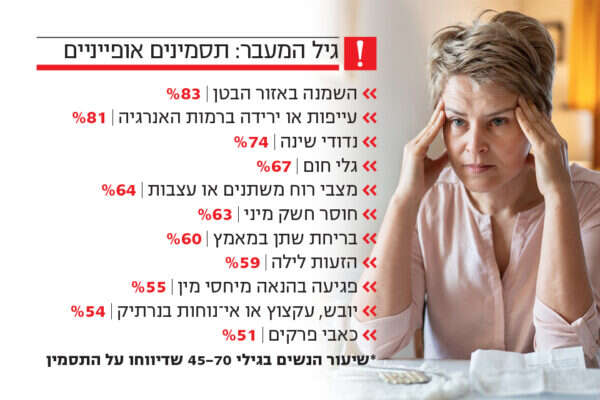 סקר: מתוך כ־80% מהנשים בגילי 70-45, רק כשליש דיווחו לרופאים על תסמיני גיל המעבר • יתרה מזו, פחות ופחות נשים מאמינות ביעילות הטיפולים • יו"ר האגודה לגיל המעבר: "מחלות רבות יכולות להימנע בטיפול מקדים"