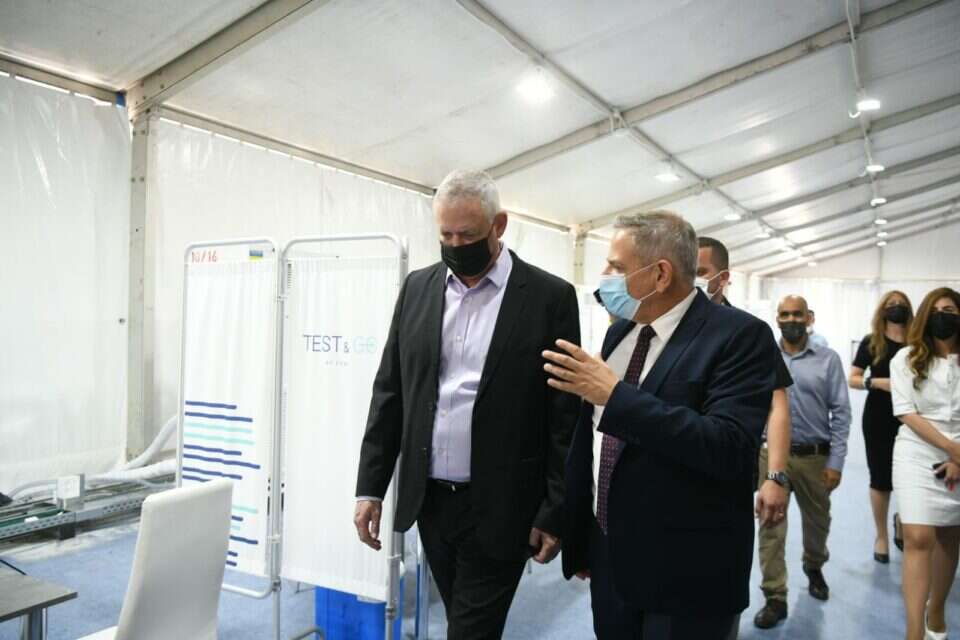 השרים גנץ והורוביץ בביקור במתחם החיסונים בנתב"ג // צילום: גיל קרמר