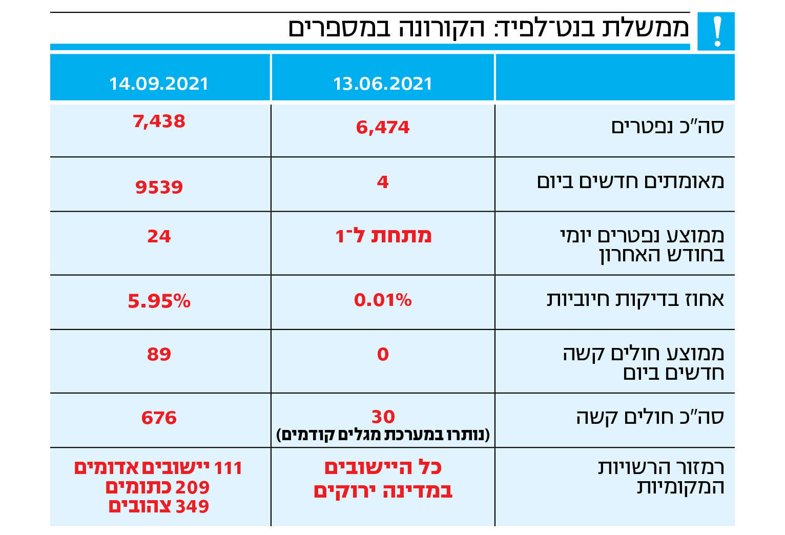 לפי נתוני ארגון המדינות המפותחות (ה־OECD), באמצע יוני הייתה ישראל מהמדינות שבהן מספר המאומתים החדשים לקורונה (ביחס לגודל האוכלוסייה) הוא מהנמוכים בעולם, ארבעה ביום; וכעת, עם כ־10,000 מאומתים ביום, הוא הגבוה בעולם - אפילו לפני בריטניה וארה"ב. כך גם לגבי המתים מקורונה: התמותה היומית בישראל עמדה באמצע יוני השנה על מת אחד ביום - מהנמוכות שבעולם המפותח, לצד מדינות כמו דנמרק, נורבגיה ופינלנד - ועכשיו ישראל היא בצמרת המפוקפקת, האכזרית והבלתי נסלחת של התמותה היומית לפי גודל האוכלוסייה.