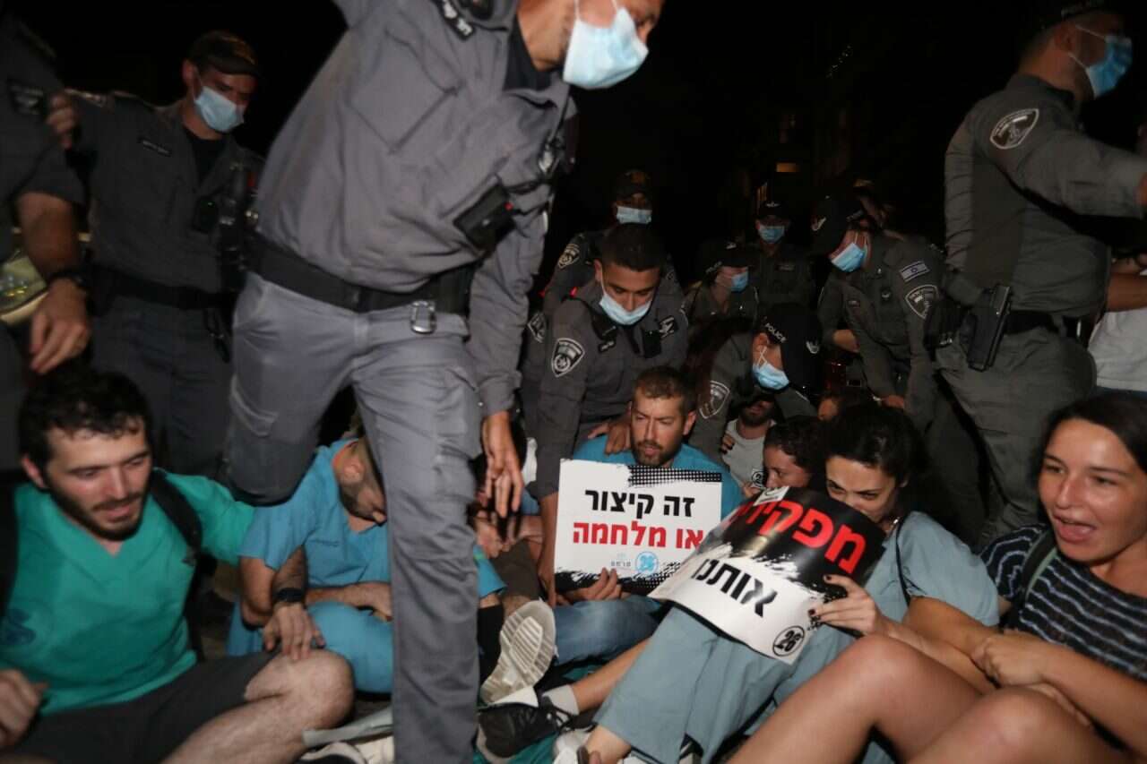 מאות מפגינים מארגון הרופאים המתמחים "מרשם" חסמו הערב (שני) את רחוב אבן גבירול בתל אביב, כחלק מהמאבק לשינוי תנאי התורנויות ומשמרות המתמחים. המפגינים שרפו בגדי רופאים (סקראבס) בסמוך לביתו של שר הבריאות ניצן הורוביץ.