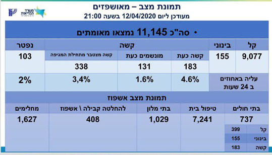 נכון לשעה 21:00 הערב, 103 נפטרו מקורונה ברחבי הארץ ו-11,145 ישראלים נדבקו בנגיף. 183 מהחולים מאושפזים במצב קשה, מתוכם 131 מונשמים. בנוסף, 155 מהחולים מוגדרים במצב בינוני ו-9,077 במצב קל. במלוניות ההבראה נמצאים כעת 1,029 ישראלים ו-7,241 חולים בטיפול בית. במקביל, 1,627 החלימו מהמחלה.