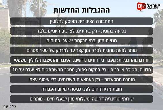 על פי ההגבלות החדשות, ניתן יהיה לצאת לתפילה, חתונה, הלוויה או ברית - רק במקום פתוח שאינו במבנה, כאשר מספר המשתתפים קטן מ-10 ויש ביניהם מרחק של 2 מטרים לפחות בין אדם לאדם. הוחלט לאפשר פעילות של הסעדה חנויות מחשוב וביגוד אך רק באמצעות משלוחים עד הבית.