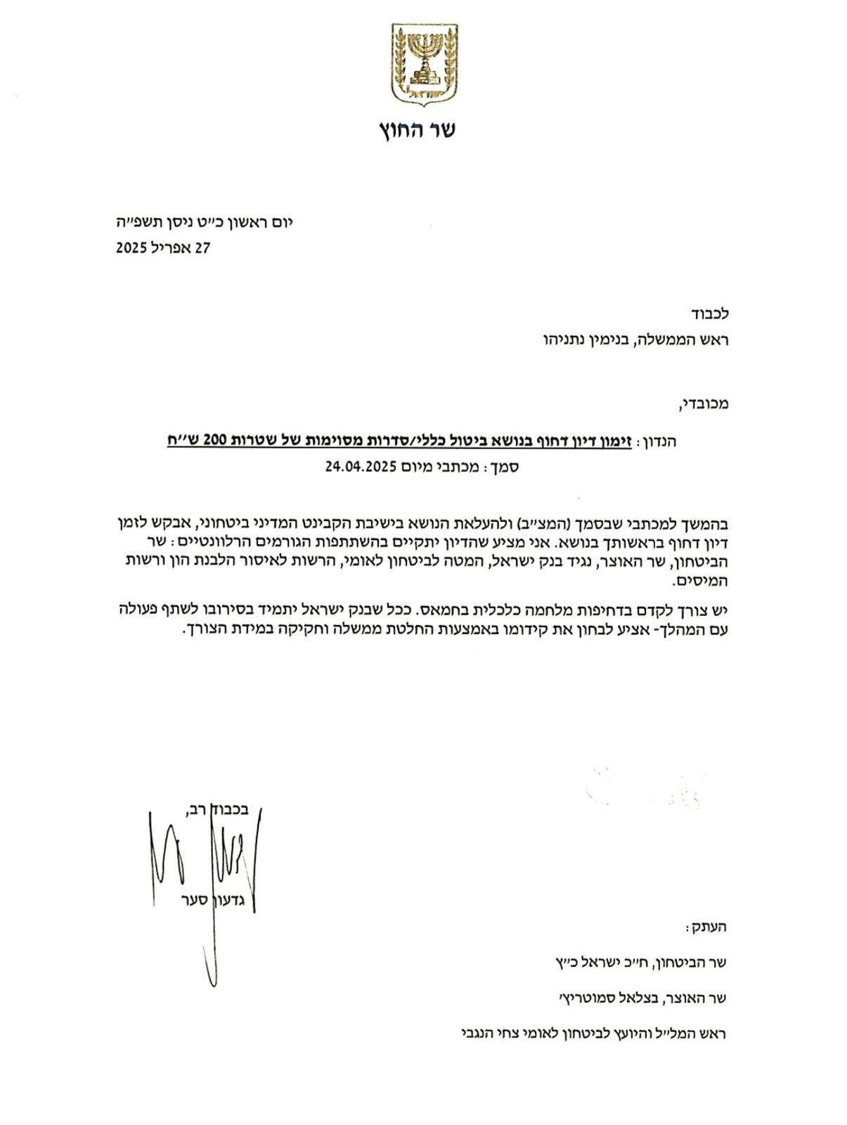 שר החוץ גדעון סער פנה לפני זמן קצר לראש הממשלה לקיום דיון דחוף בנושא הצעתו לביטול שטרות ה-200 ש״ח באופן כללי/ביטול סדרות של השטר שנכנסו לעזה.