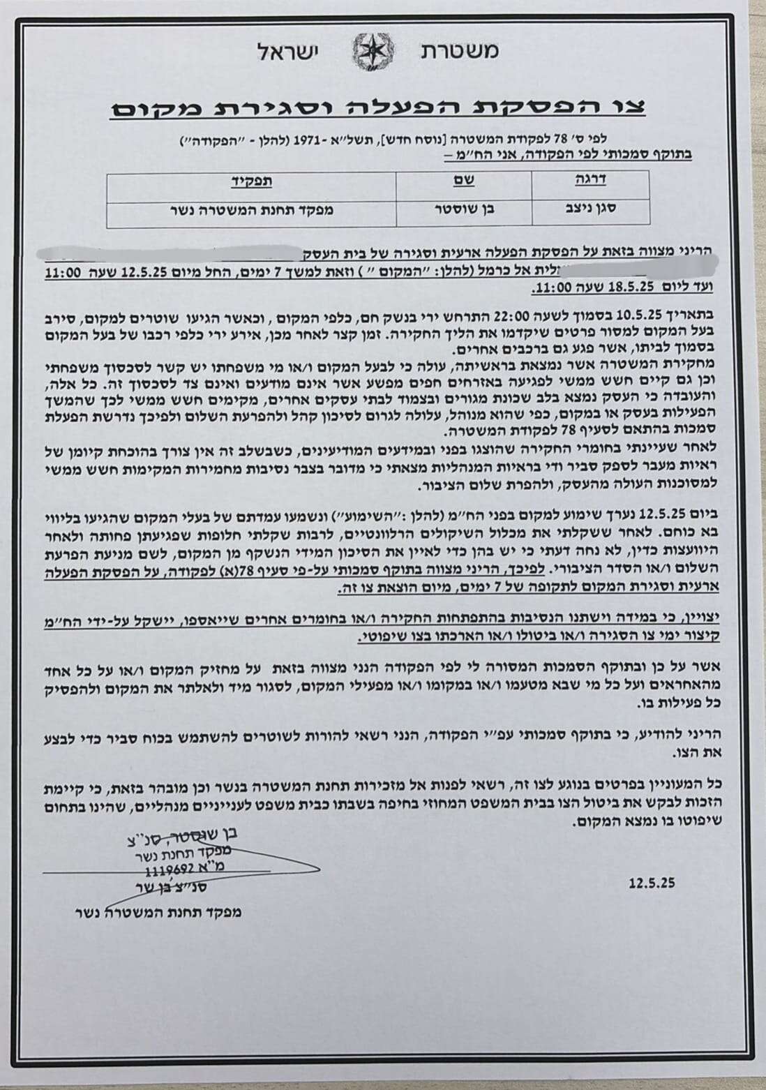 צו סגירה לעסק בדליית אל כרמל, בו אירע אירוע ירי, צילום: דוברות המשטרה