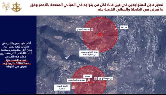 דובר צה"ל בערבית, אל"מ אביחי אדרעי, פרסם הערב (חמישי) אזהרה דחופה לתושבי הכפר עין קנא בלבנון: "כל הנמצאים במבנה המסומן באדום ובמבנים הסמוכים לו – מתבקשים להתפנות מיידית ולהתרחק לפחות 500 מטר, בשל קרבה למתקני חיזבאללה".
