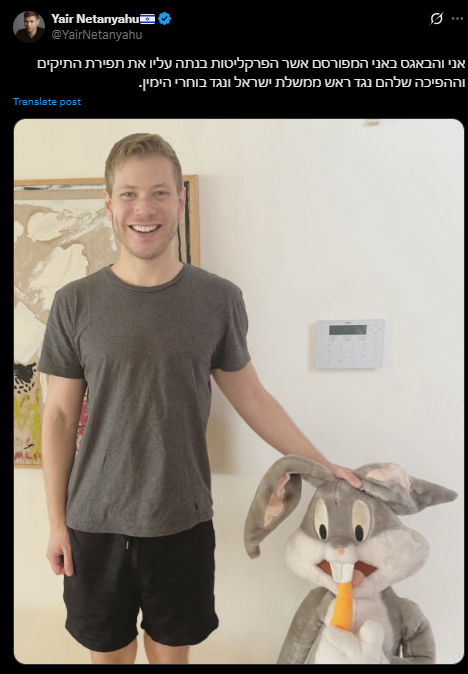 יאיר נתניהו, בנו של רה"מ מפרסם תמונה עם הבובה של באגס באני, שעלתה בחקירות אביו. כזכור, בעדותו של רה"מ עלתה בקשה לכאורה של שרה נתניהו מארנון מילצ'ן לבובה עבור יאיר. בפוסט כתב: "אני והבאגס באני המפורסם אשר הפרקליטות בנתה עליו את תפירת התיקים וההפיכה שלהם נגד ראש ממשלת ישראל ונגד בוחרי הימין".