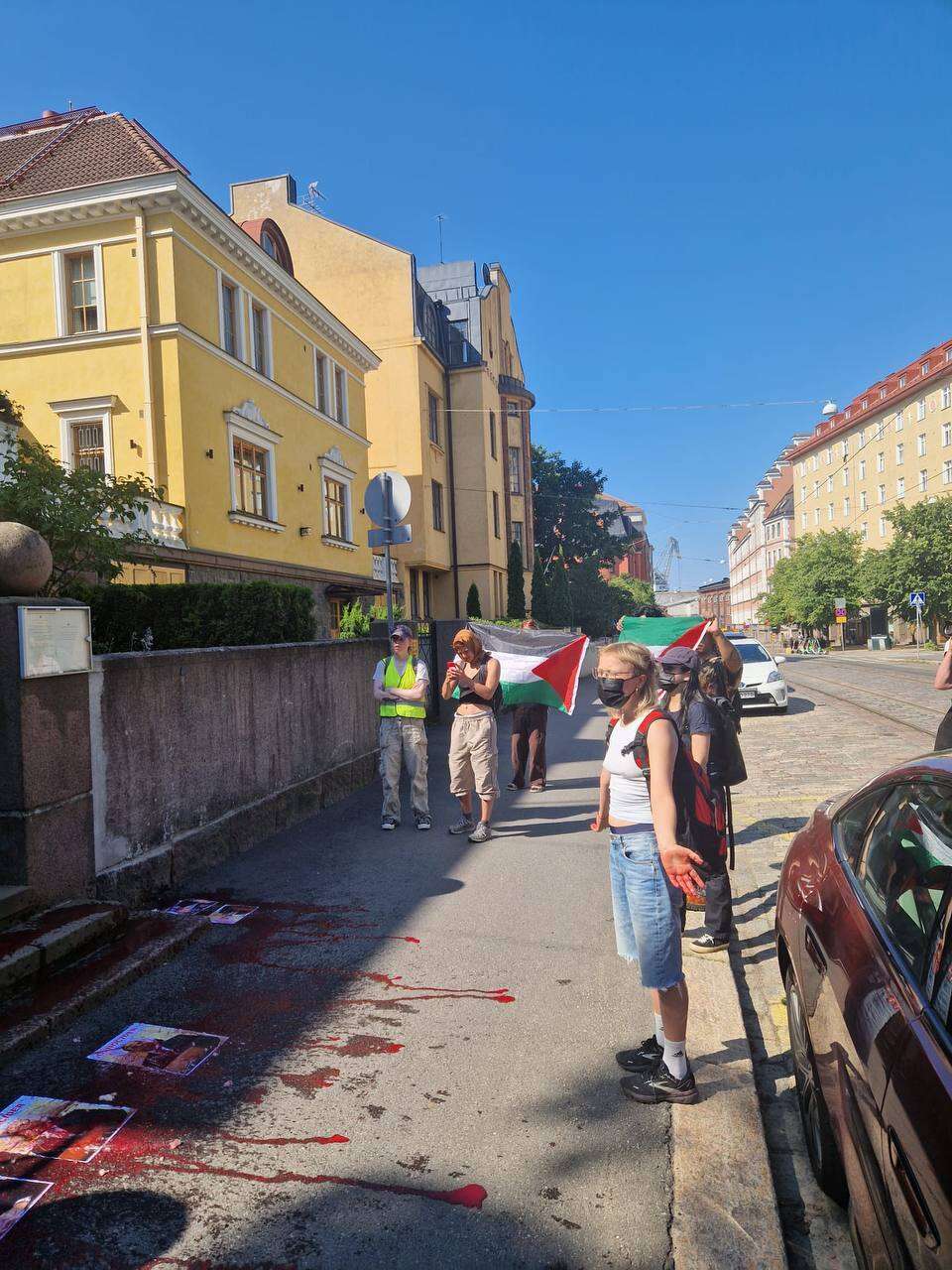 במחאה על חסימת מעבר רפיח, הרעב ו"השתיקה מול מעשי ישראל בעזה", פעילים ניסו לחסום את הכניסה למבנה שגרירות מצרים בפינלנד, הניפו את דגל פלשתין וריססו צבע אדום דמוי דם.