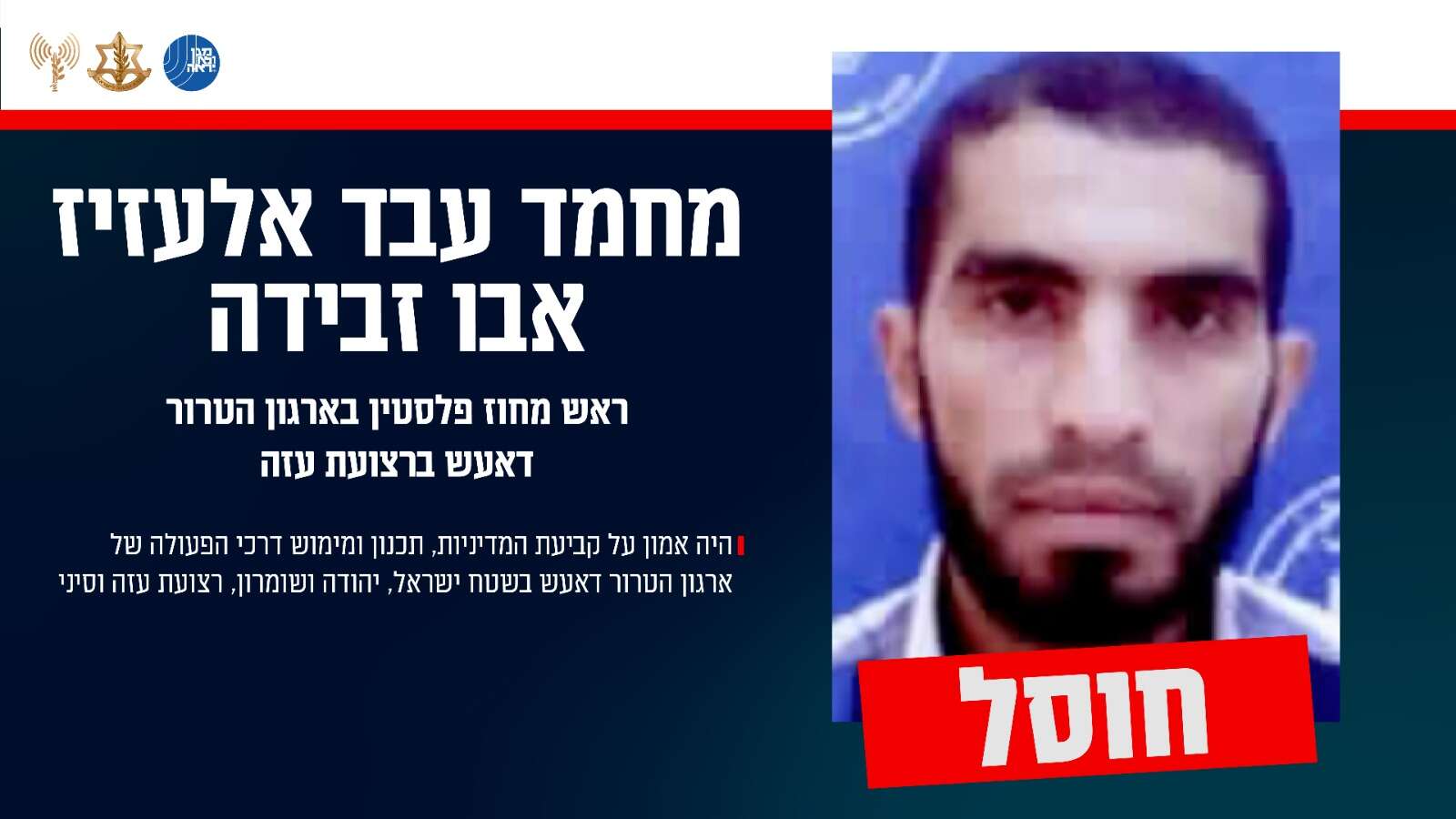 במהלך השבוע האחרון, צה"ל תקף וחיסל באמצעות כלי טיס, בהובלת פיקוד הדרום ובהכוונת אמ"ן, את ראש מחוז ״פלסטין״ בארגון הטרור דאע״ש ברצועת עזה, המחבל מחמד עבד אלעזיז אבו זבידה, במרחב אל בוריג’.