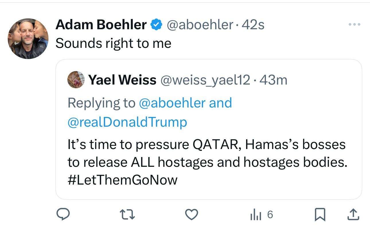 אדם בוהלר, שליח טראמפ לבני ערובה, שיתף הלילה (חמישי) ציוץ ברשת X בו נכתב "הגיע הזמן ללחוץ על קטאר, הבוסים של חמאס, שישחררו את כל החטופים והחללים". בוהלר צייץ "נשמע נכון בשבילי".