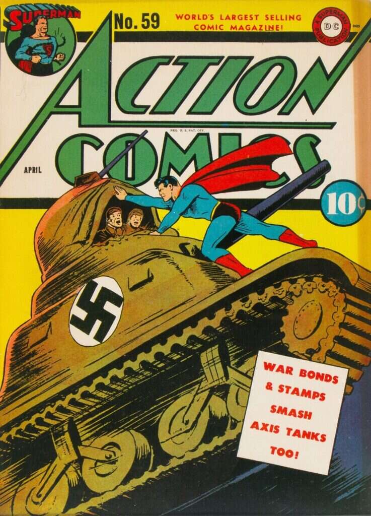 שוורץ מספר על דוגמה מרתקת נוספת מ-1940, כאשר על שער חוברת קומיקס של קפטן אמריקה נראה הגיבור מכה את היטלר. "זאת הייתה הצהרה נועזת מאוד לתקופה, כאשר רוב האמריקאים התנגדו לכניסה למלחמה נגד גרמניה. קפטן אמריקה נוצר על ידי יוצרים יהודים, והם הביעו את דעתם הנחרצת נגד הנאצים וקראו לפעולה, על אף הסיכון האישי שבכך".