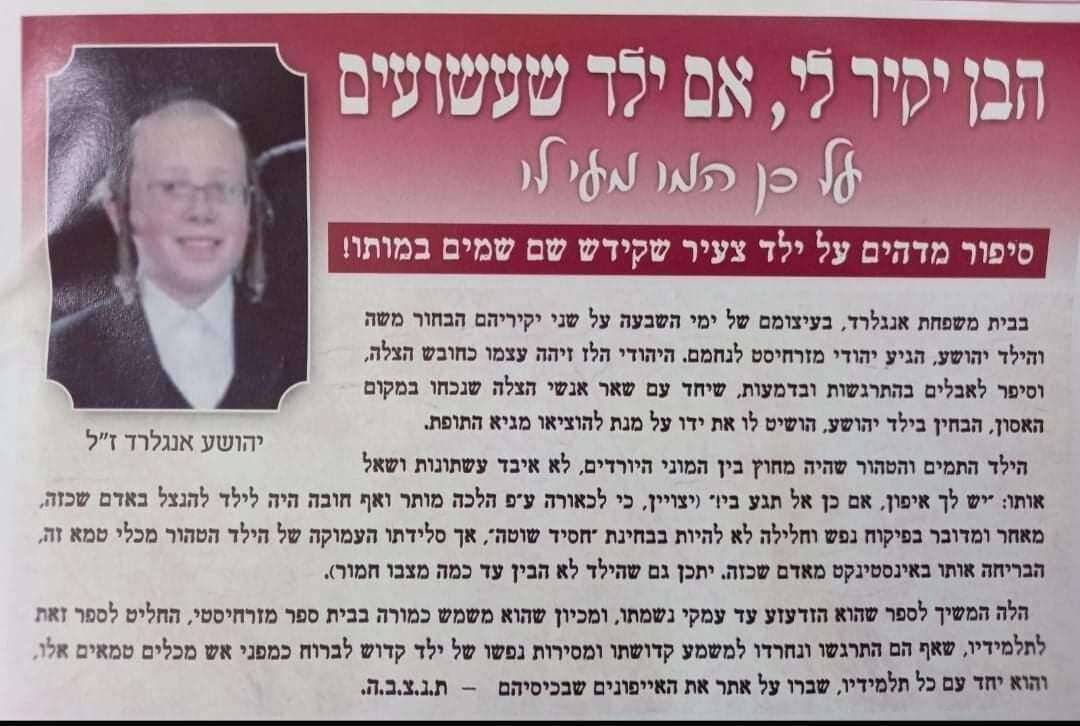 יהושע אנגלרד ז"ל (9) ואחיו משה ז"ל (14) נהרגו באסון במירון יחד עם 43 חסידים נוספים. כבר בימים לאחר האירוע יצאו הטפות קשות נגד תופעת הסמרטפונים, מצד רבנים ואדמו"רים במגזר החרדי, בטענה כי זו אחת הדרכים לכפר על האירוע. אלא שהיה מי שלקח את זה צעד אחד קדימה.