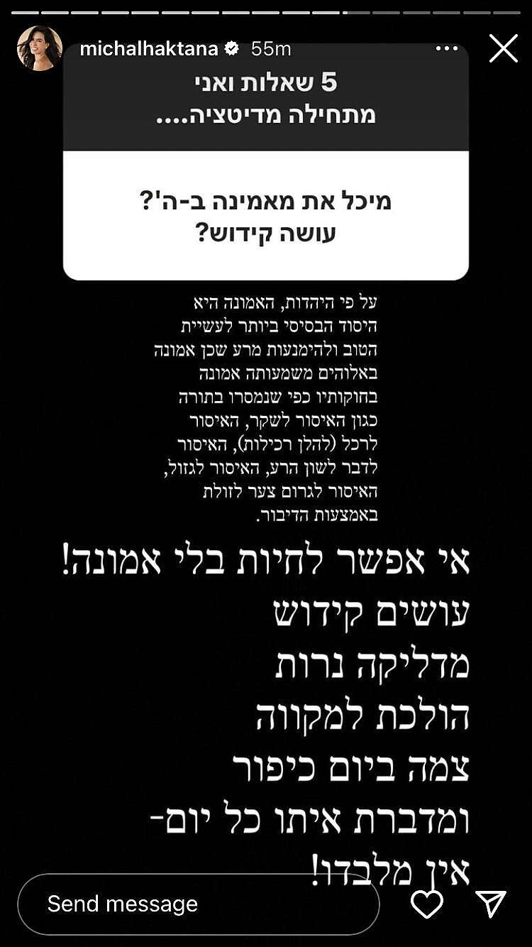 "מיכל, את מאמינה באלוהים? עושה קידוש?", שאלו גולשים שביקשו להבין היכן היא עומדת בימים אלה מבחינת האמונה שלה.