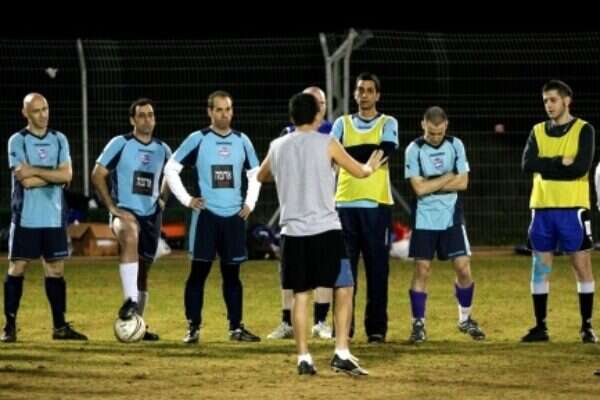 צילום: רוני שיצר // נבחרת הסופרים הישראלים באימון. בגופייה הצהובה במרכז: אבי שילון