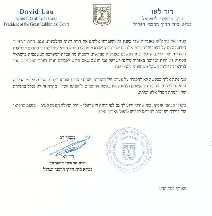 הרב הראשי, דוד לאו, פנה בעניין ליועמ"ש אביחי מנדלבליט על מנת שיתערב בנושא באמצעות העברת חוות דעת לבית המשפט, ויסייע למשפחה לשנות את רוע הגזרה.