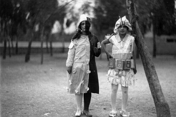 בתמונה השלישית, שצולמה ב-1926, מתועדים ילד וילדה בתחפושות מקוריות – הילדה "חצויה" לשניים – מחצית מגופה בלבוש שחור ומחציתה בלבן, והילד לבוש בשמלה מקושטת בסמלים יהודיים, ביניהם מגני דוד וקופות קרן קימת לישראל. תמונה זו משקפת את היצירתיות ואת האופן שבו ערכים לאומיים באו לידי ביטוי בקרב צעירי התקופה.