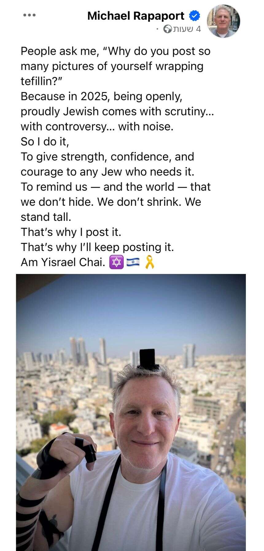 השחקן והקומיקאי היהודי-אמריקני מייקל רפפורט, שהפך בשנתיים האחרונות לפעיל הסברה מוצהר למען מדינת ישראל ושוהה בימים אלו בארץ, העלה היום (ראשון) פוסט לפייסבוק בו הוא מסביר את חשיבות התפילין עבורו.