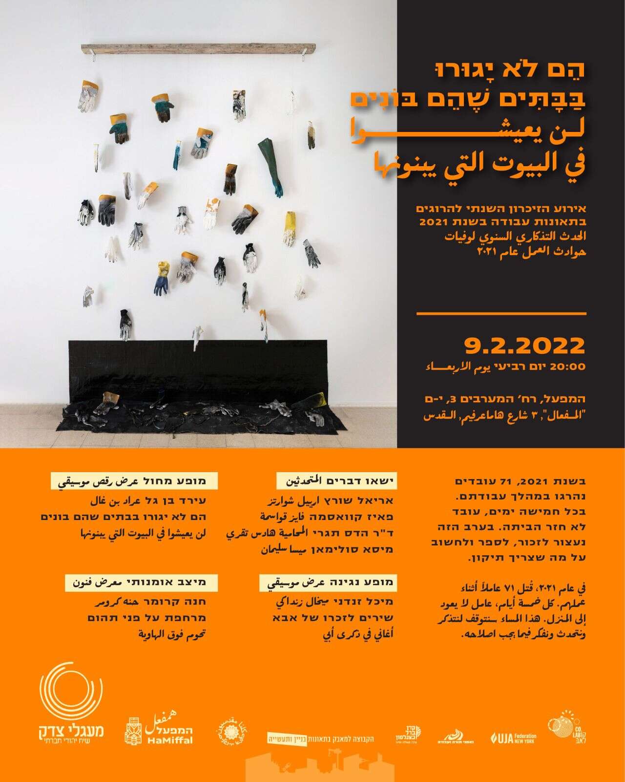 האירוע, שנערך לזכרם של 71 ההרוגים בתאונות העבודה ב-2021, יתקיים בירושלים ובו תופיע מיכל זנדני, בתו של הרב זכריה זנדני ז"ל שנהרג בתאונת עבודה ביולי האחרון. מטרת האירוע, אומרים בארגון "מעגלי צדק", היא לקרוא יחד לדאגה לשלומם של העובדים ולבנייתה של הארץ מתוך דאגה לחלש ושמירה על חיים אדם שנבראו בצלם אלוהים". בארגון נוהגים להגיע לאתרי בנייה שבהם נהרגים פועלים ולערוך טקס זיכרון לזכרם עם נרות.