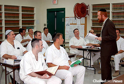 הרב גולדשטיין מעביר שיעור בבית כלא בטקסס // צילום: Chabad.org