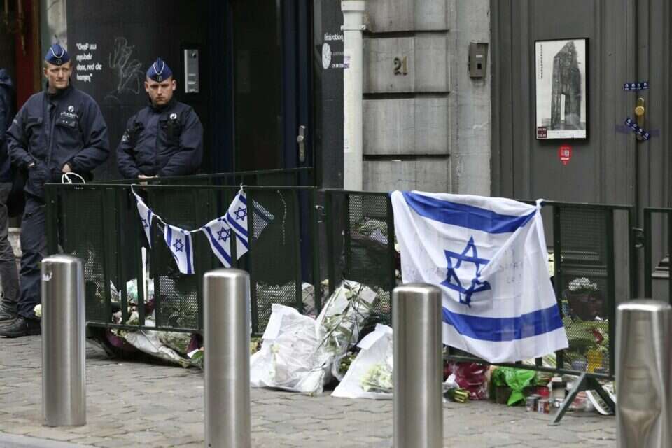 שוטרים מחוץ למוזיאון היהודי בבריסל אחרי הפיגוע. צילום: רויטרס