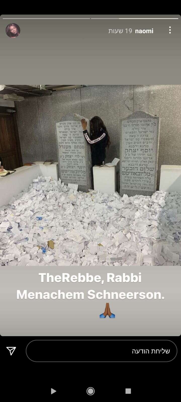 בפוסט באינסטגרם שפרסמה לפני שנתיים ביום הציון לזכרו של הרבי כתבה אז כי "הרבי מנחם שניאורסון הוא מנהיג מלא השראה, תלמיד חכם ומורה. הרבי לימד שכולנו טובים מטבענו, ולכל אחד מאתנו יש פוטנציאל לשנות את העולם לטובה באמצעות מעשה אחד טוב. למדתי מחוכמתו והוראותיו כל כך הרבה, ולמרות שמעולם לא פגשתי אותו, הגעתי לקבר שלו בקווינס כדי לקבל ברכה והשראה".