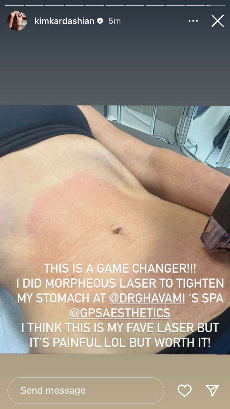 "עברתי טיפול במכשיר המורפיאוס כדי להדק את הבטן שלי", הסבירה. "אני חושבת שזוהי השיטה המועדפת עליי, אבל היא כואבת", הזהירה את מאות מיליוני עוקביה כשהיא מציגה בטן אדומה וצורבת כתוצאה מהטיפול, אך מייד לאחר מכן הבהירה באופן חד־משמעי כי הסבל הכרוך בטיפול הקוסמטי בהחלט שווה את זה.