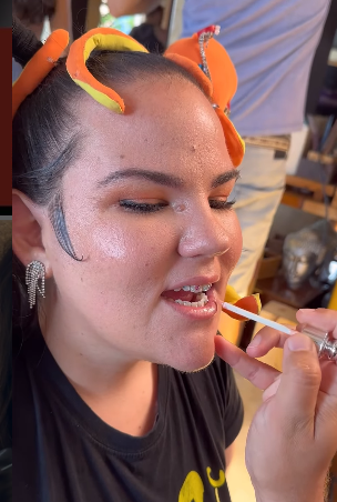 הפעם היא בחרה לכבוד השיר והקליפ החדש שייצא מחר (רביעי) 30/8/23 להדביק על השיניים שלה אבנים קטנות וצבעוניות.