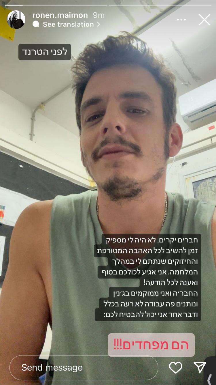 "חברים יקרים, לא היה לי מספיק זמן להשיב לכל האהבה המטורפת והחיזוקים שנתת לי במהלך המלחמה", ציין מיימון. "אני אגיע לכולכם בסוף ואענה לכל הודעה", הבטיח.