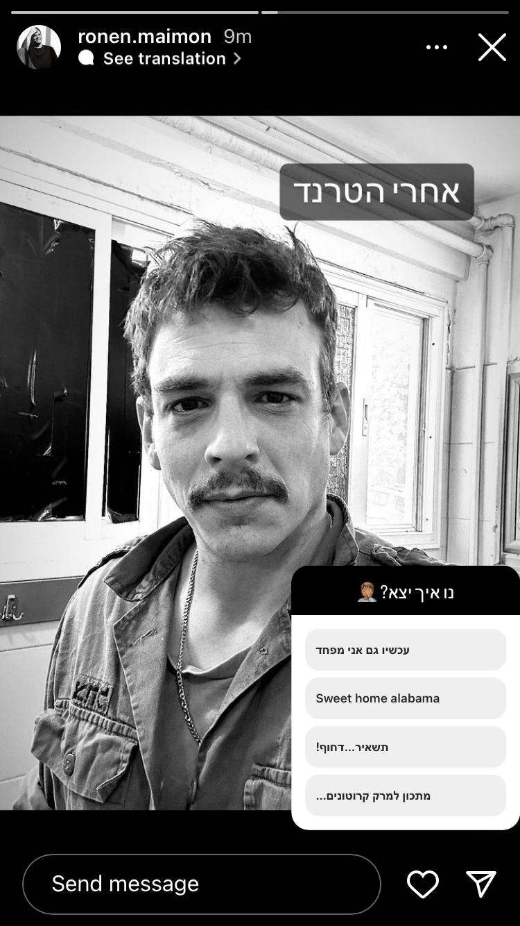 רונן מיימון שרבים זוכרים בעיקר ממערכת היחסים רווית המהמורות שניהל על המסך הקטן עם בת הזוג ששודכה לו בתוכנית "חתונה ממבט ראשון" רותם פיינברג, מצא היום (שלישי) זמן לטפח את הקשר עם הגולשים הנחשפים לתכניו באינסטגרם וממקום שהותו בגדה המערבית חשף בפניהם רמזים לפעילותו כלוחם בימי אלה.
