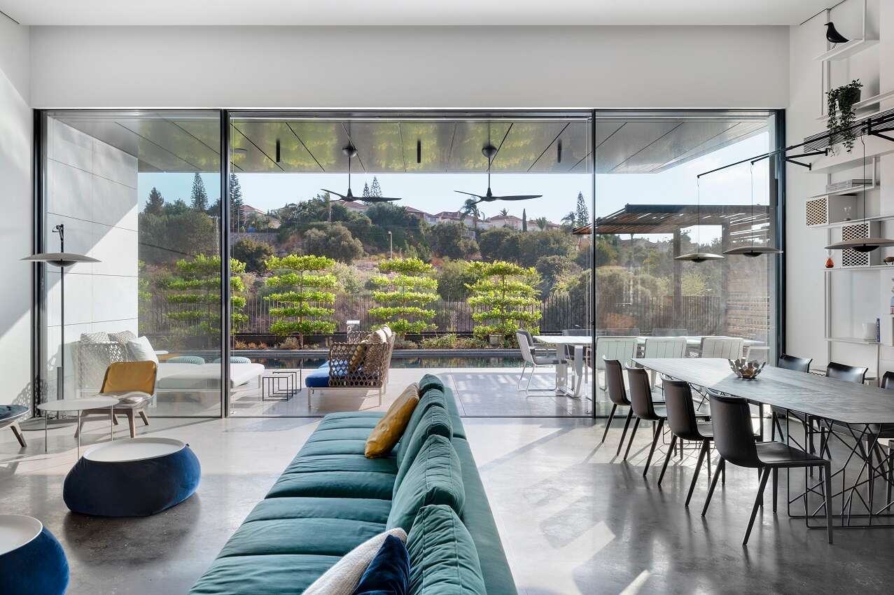 החוץ הופך להיות התפאורה: כשבוחרים בקירות שקופים, אין הרבה מקום לתלות תמונות. שטחי החוץ הופכים להיות התפאורה, ורצוי לתחזק אותה באמצעות גינה פורחת. בתכנון הגינה אפשר לבחור צמחים עמידים יותר, שאינם דורשים תחזוקה מיוחדת. אופציה נוספת, שהיא גם קצת יותר אקולוגית מבחינת חיסכון במי השקיה, היא לרצף את החוץ באריחי ענק במראה בטון, באבנים גדולות או בכל אריח אחר שיפה בעיניכם ומתאים לחוץ. את השטח המרוצף אפשר לתחום ברצועת אדמה צרה, שבה תשתלו צמחי תבלין. המראה הזה אינו נופל ממראה גינה עשירה, ומומלץ בחום להביא אותו בחשבון.