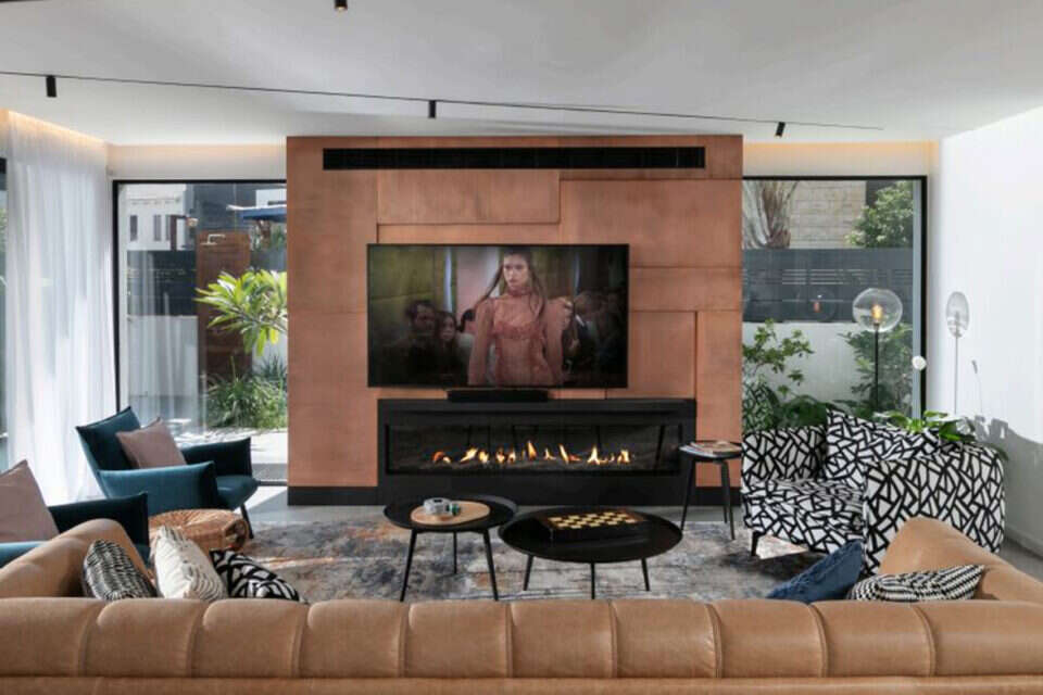 גריל המזגן השחור הותקן בהתאמה לקמין שמותקן גם הוא על אותו הקיר, צילום: איתי גונן