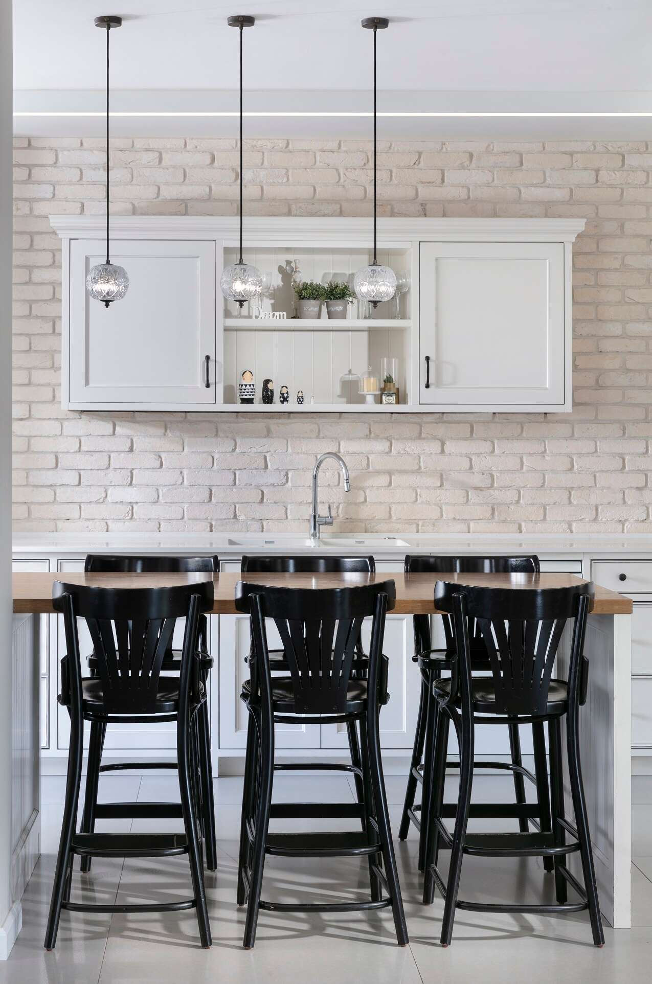 פינת האוכל ממוקמת בין המטבח לסלון. הכיסאות שנבחרו מרופדים ומציעים ישיבה נוחה למשך זמן ממושך. לעומתם כסאות הבר סביב האי במטבח עשויים מעץ וצבועים בשחור. הפרט הזה אמנם לא נראה חשוב במיוחד, אבל הוא יוצר קשר מעניין בין שני סוגי הכיסאות ותורם לעניין בחלל.