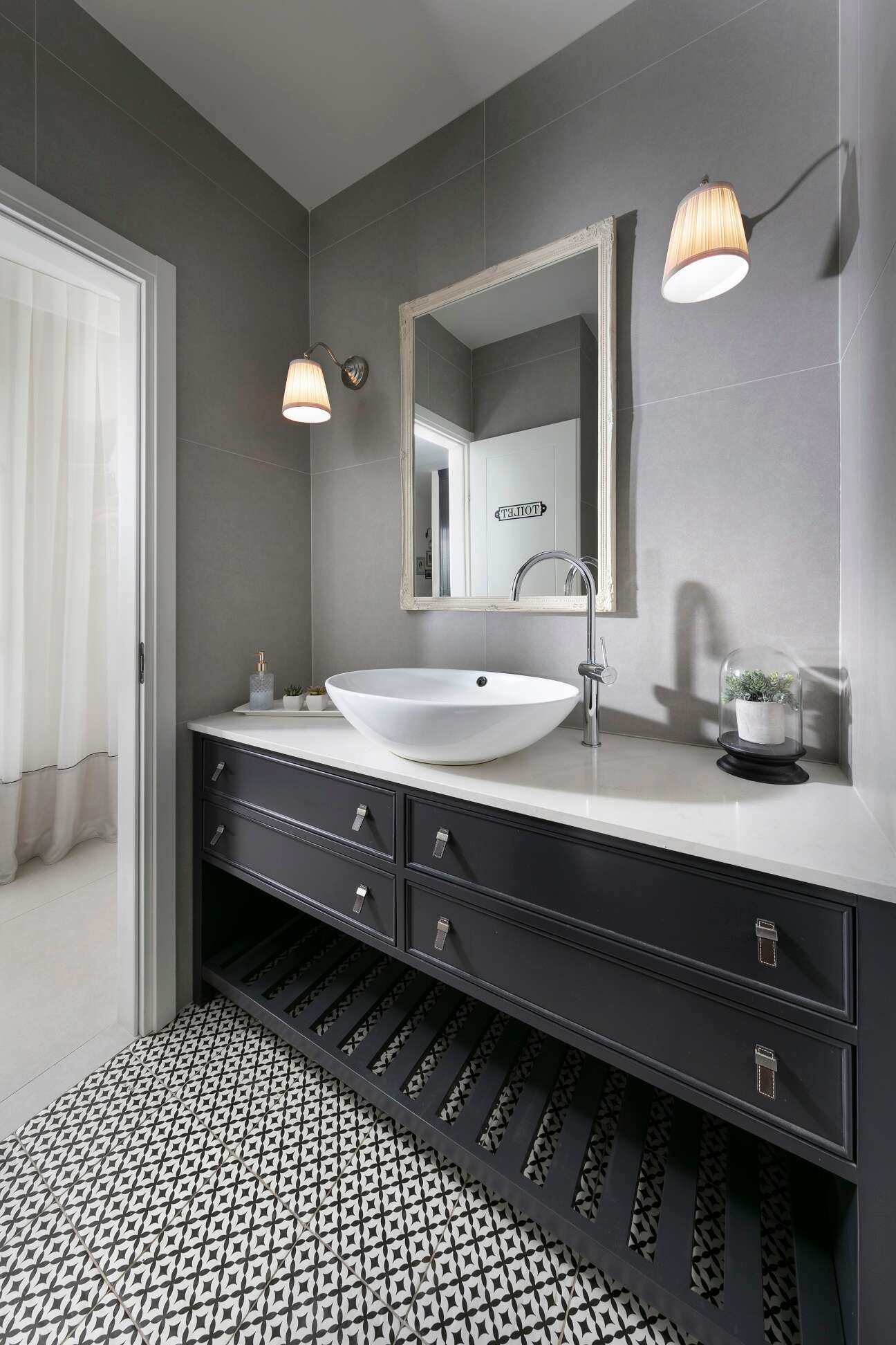 הריצוף בחלל הרחצה מורכב מריצוף מעוטר שמזכיר דוגמת פפיטה, שמגדיר את רוב החלל. בחדר הרחצה נבחר ריצוף במראה עץ טבעי. בעת התכנון יצרו המעצבות עיבוי בקיר כדי להטמיע בו את צנרת האינסטלציה, וכך נוצרה נישה למקלחון. חיפוי באריחים בגוון אפור בהיר יוצר רקע מאזן.