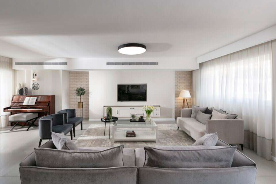 במבנה המקורי היו בסלון שני חלונות ולא היה מקום לקיר טלוויזיה. כמו כן היה קושי במציאת מקום למזגן, משום שגובה התקרה לא אפשר הנמכה נוספת. במהלך השיפוץ שולבה מערכת מזגן אנכית, ובאופן הזה נוצר סלון רחב ידיים ונעים.