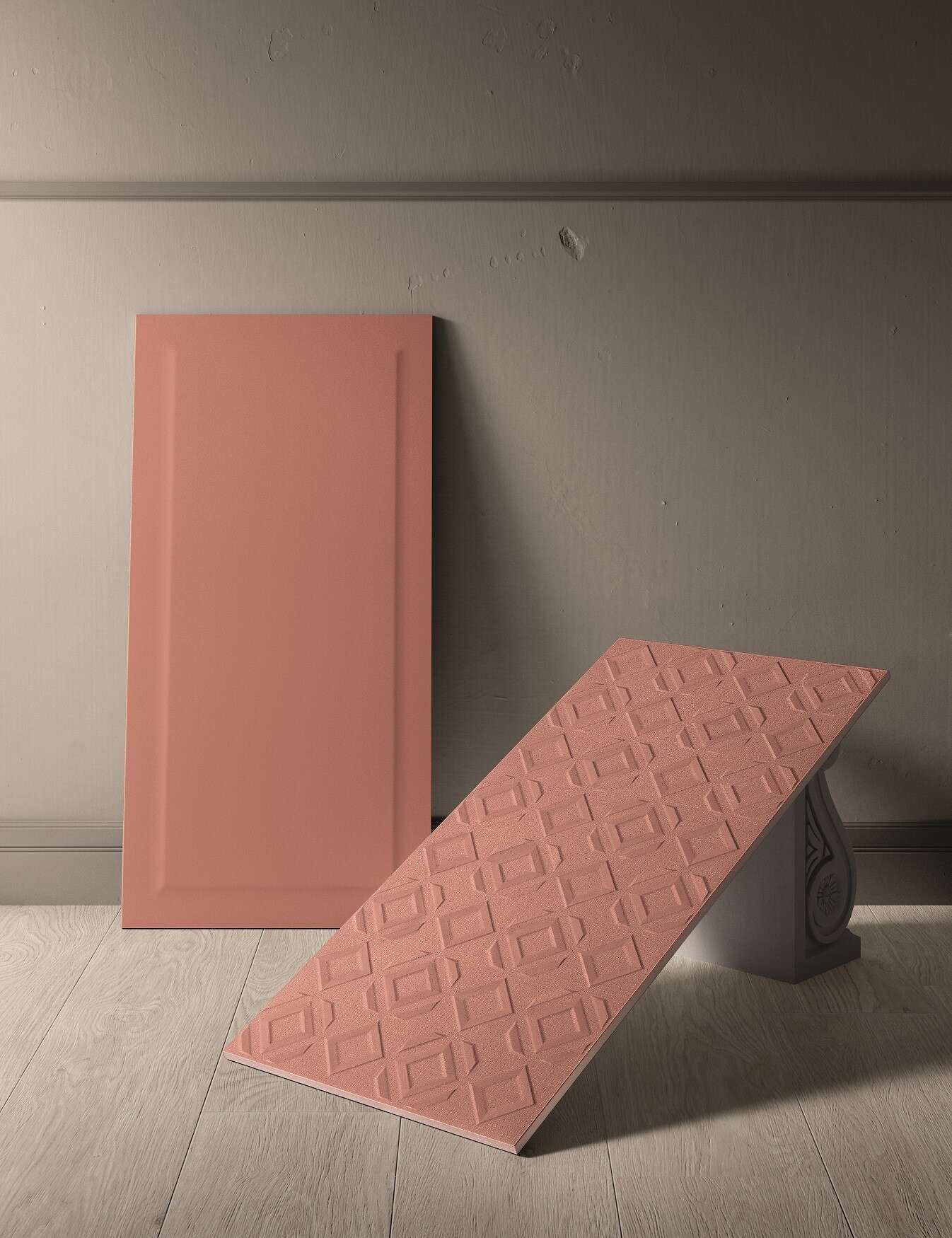 אריח חלק לצד אריח מאותה הסדרה בגימור דוגמא מובלטת, אלוני, צילום: אסף לוי