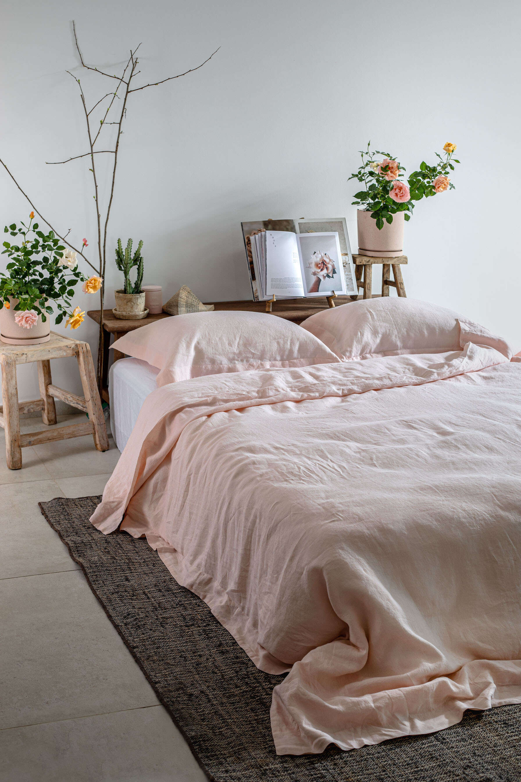 הפשתן הוא חומר נושם, מנדף לחות, עמיד, שמתרכך לאורך הזמן. מצעי פשתן בגוון פודרה, 1,320 שקל (במקום 1650 שקל), Cotton Club, צילום: דרור קליש, סטיילינג: לינוי לנדאו