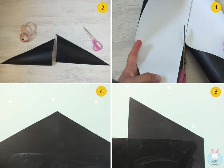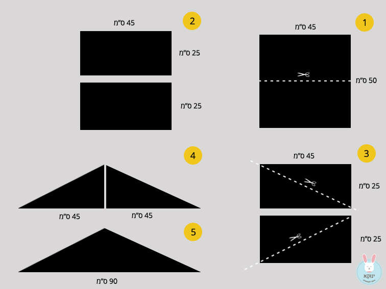 6. ליצירת הגג של הבית נשתמש במדבקה בגודל 45X50 ס"מ. נגזור אותה לחצי, כך שיתקבלו שתי מדבקות בגודל 45X25 ס"מ. נגזור כל אחת מהן באלכסון. בכל פעם מכיוון אחר (ראו שרטוט), כך שייווצרו שני משולשים ישרי זווית.