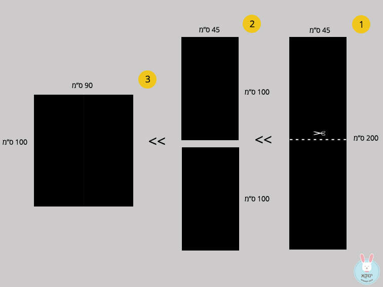 2. גוזרים לחצי את מדבקת הקיר הגדולה במידה 45X200 ס"מ כך שמתקבלות שתי מדבקות, כל אחת במידה 45X100 ס"מ. מדביקים את שני החלקים זה לצד זה, בחפיפה קטנטונת של כחצי ס"מ, עד שמתקבלת מדבקה אחת בגודל 90X100 ס"מ בערך.