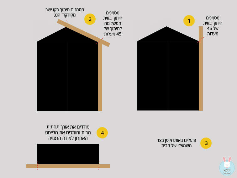 9. פועלים באותו אופן בדיוק בצד השמאלי של הבית. מסמנים זווית של 45 מעלות לחיתוך בלייסט באורך 110 ס"מ, הצמוד לדופן הבית השמאלית, ולאחר מכן, מסמנים את שני החיתוכים הנוספים בלייסט (באורך 70 ס"מ) הצמוד לצלע המשולש השמאלית.