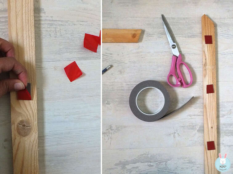 11. לאחר שכל הלייסטים חתוכים ומוכנים, זה הזמן להדביק אותם ולתחום את מדבקת לוח הגיר שיצרנו על הקיר. הופכים כל לייסט וממקמים ריבועים של דבק דו צדדי במרחקים של כ-10 ס"מ זה מזה. מקלפים ומצמידים אל הקיר.