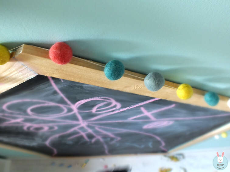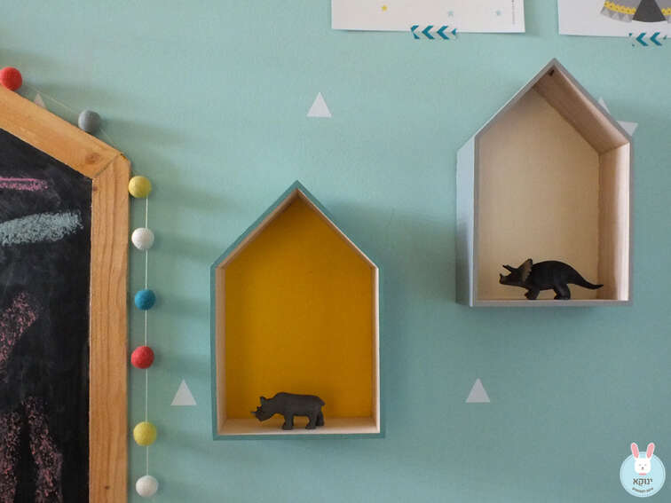 כדי להשלים את הקומפוזיציה ניתן להיעזר בעזרת זוג פוסטרים מתוקים שמתכתבים עם צבע האקווה שבקיר, ולהדביק בוואשי טייפ טורקיז. תחתיהם תליתי זוג מדפי בית שמתחברים לצבעוניות הקיימת על הקיר ובשאר החלל, ואבזרתי בדינוזאור וקרנף. להשלמת המראה הוספתי גרלנדת פונפונים צבעונית מעל מסגרת לוח הגיר, שמוסיפה צבע ושיק והרבה שמח בעיניים.