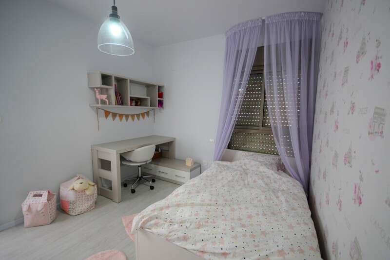 נזירי לוקחת בחשבון כי הילדים מתבגרים במהירות ולכן זקוקים לעיצוב שיתאים לאופיים העכשווי כך גם ילווה אותם לאורך שנים רבות. לכן כשהגיעה לעצב את חדרה של טליה בת ה-8, בחרה במיטה ברוחב 1.20 מ' ובארון בצבעים ניטרליים. על מנת שהילדה תתחבר לחדר כבר ותרגיש בו בנוח, הוסיפה טפט למראה ילדותי יותר ווילון סגול עדין ורך.