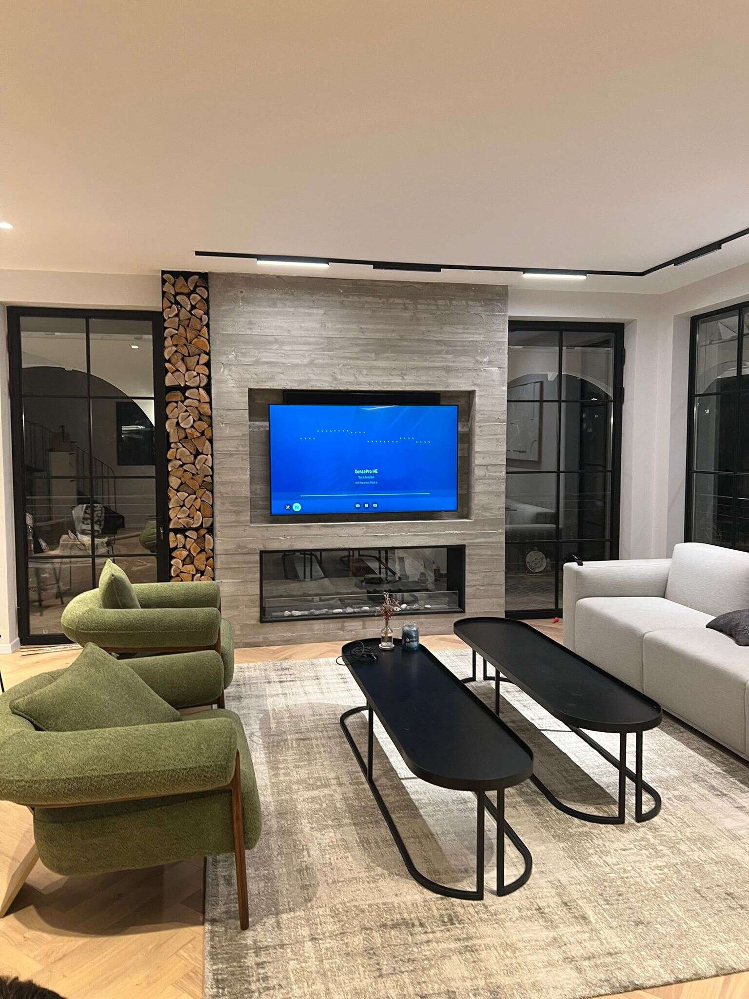 הסלון משלב ניגודיות מעניינת בין חום לקור - קיר כוח במראה בטון חשוף ושולחנות סלון ממתכת, פוגשים שתי כורסאות מרופדות בד בגוון ירקרק ושטיח עם נוכחות. על קיר הכוח ממוקם מסך הטלוויזיה, ותחתיו קבוע קמין שמחמם את האווירה. משמאל לקיר הבטון אלמנט ממוקם אחסון פתוח לעצי הקמין, שמוסיפים ערימות של סטייל לחלל.