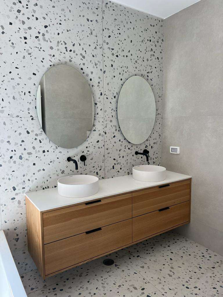 החלל בחדר הילדים נראה נקי, והריצוף והחיפוי נבחרו מאותו החומר – גרניט פורצלם במראה טרצו, וקיר נוסף במראה בטון. שילוב שידת שירות מעץ מכניסה את החמימות המתבקשת. המראות העגולות מתכתבות עם שני כיורים בצורה דומה, והברזים בגוון פחם מט, נראים כמו תכשיטים קטנים בחלל.