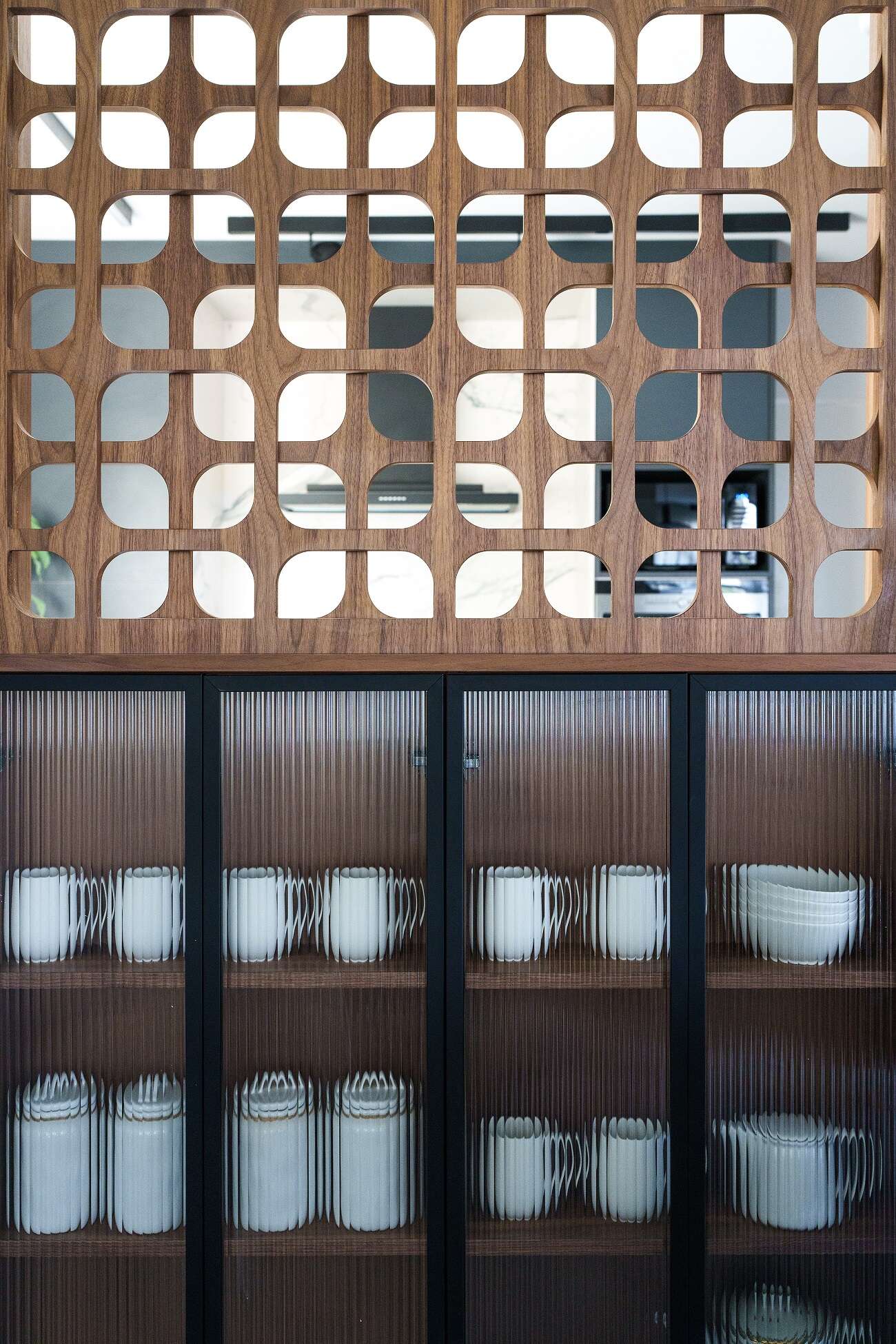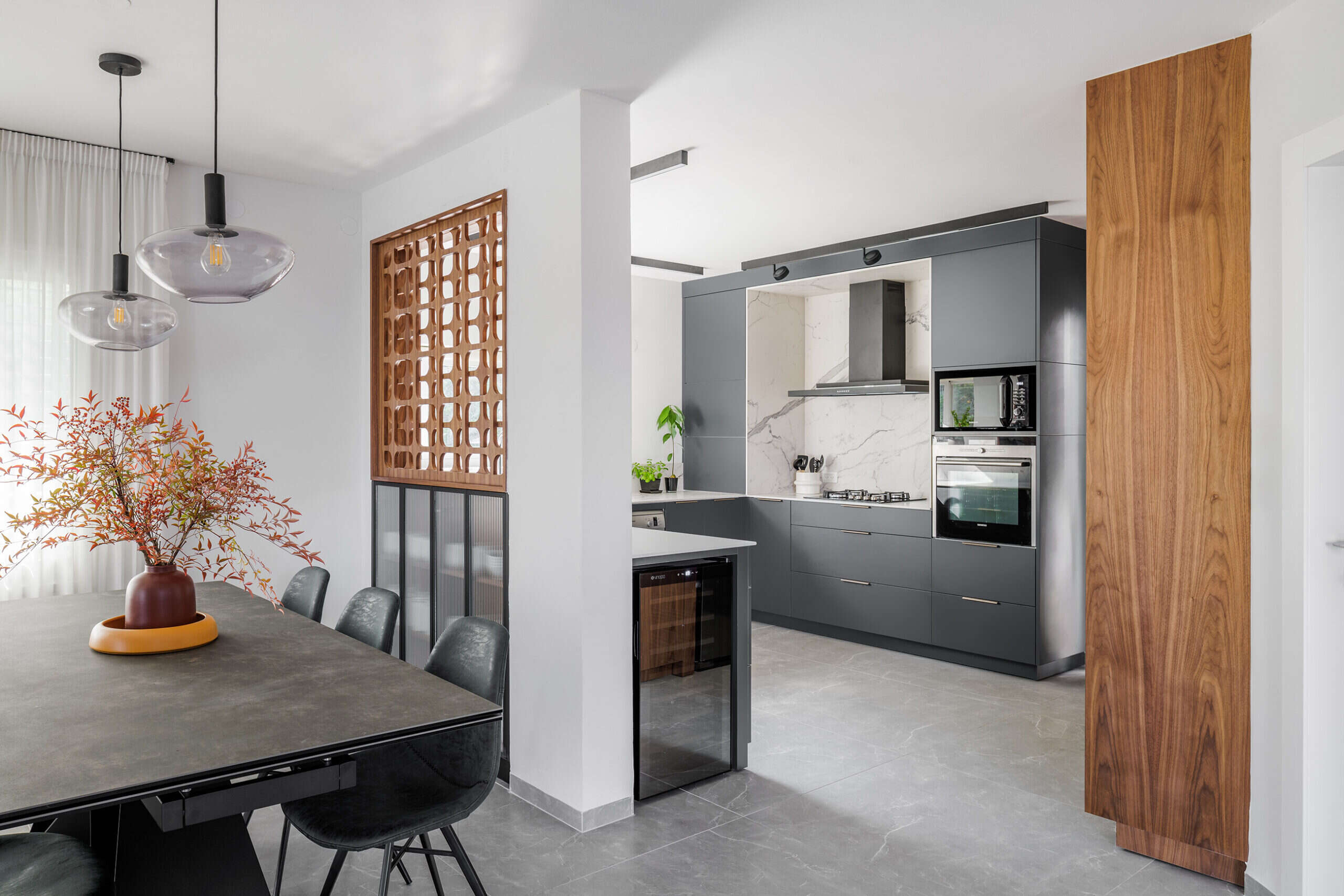 תכנון הקיר שבין פינת האוכל למטבח משלב פתרונות אחסון בחלק שמגיע עד לגובה משטח העבודה, ומהשטח ומעלה נקבע קיר משרביות בסגנון רטרו, שאיפשר הזדמנות לאמירה עיצובית שהכניסה ייחודיות ומקוריות לחלל כולו.