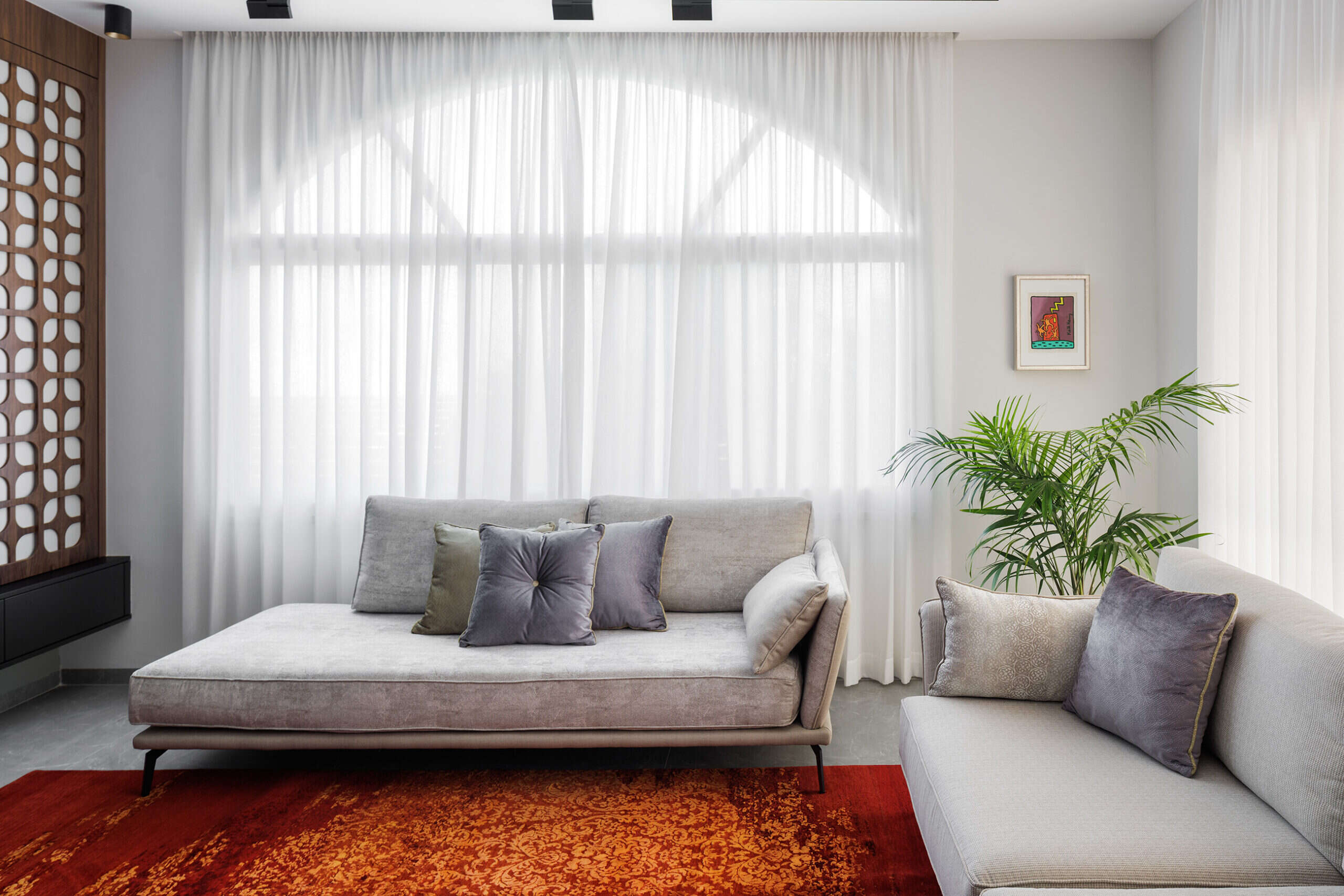 השטיח שנבחר משלב צבעוניות של אדומים וכתומים נועזים, ועל מערכות הישיבה האפרפרות שולבו כריות נוי שהכניסו כתמי צבע נוספים. על הקיר נתלתה תמונה של קית' הרינג שאוספת לתוכה את פלטת הצבעים שמופיעים בסלון ויוצרת בכך הקשרים הרמוניים.