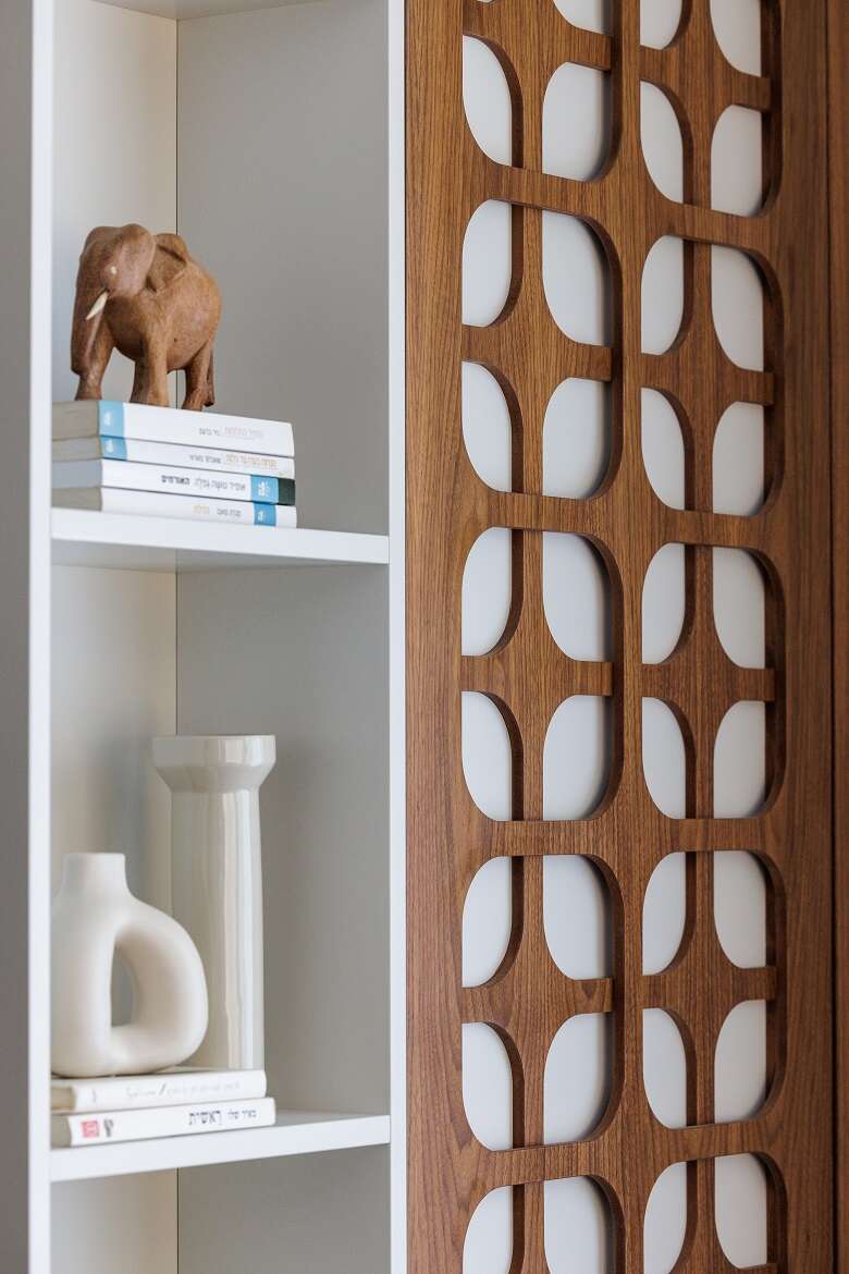 משרביות מפורניר אגוז אמריקני עם דוגמה גיאומטרית בולטות על רקע הגוונים המונוכרומטיים, ויוצרות סוג של חציצה דקורטיבית בתוך החלל. בנוסף, נבחר טקסטיל שמייצר נקודות צבע בחלל המגורים, ומשחק בין נקודות צבעוניות לפלטה מונוכרומטית בחללי השירותים והרחצה.