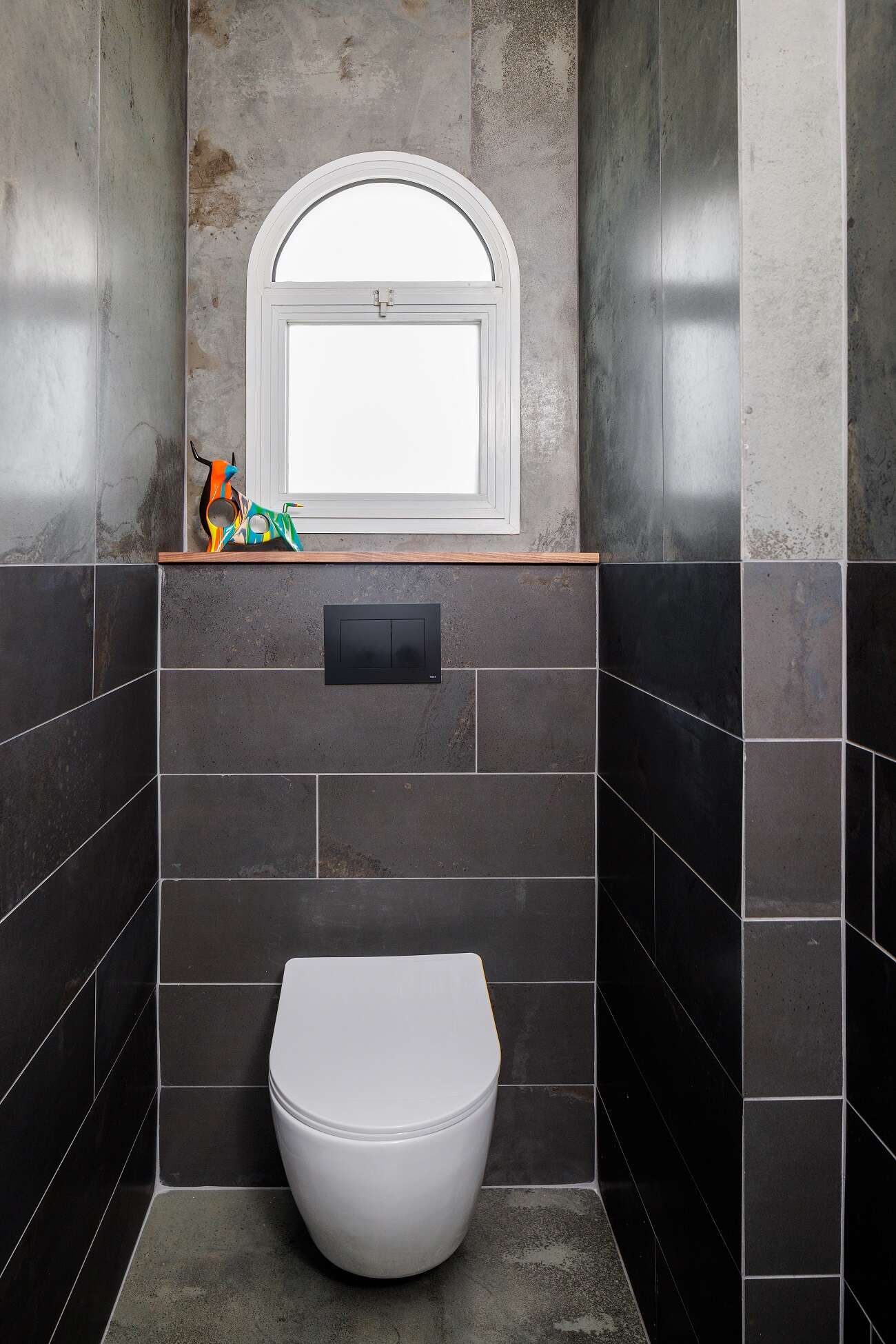 החיבה של בעלת הבית לסגנון העכשווי ולסגנון הרטרו באה לידי ביטוי גם בבחירת החיפויים של חדרי הרחצה והשירותים. לשירותי האורחים שבקומת הכניסה נבחר חיפוי כהה במראה עכשווי, ולמקלחת הכללית נבחרו אריחים גיאומטריים במראה רטרו. בשירותי האורחים נדרש להסתיר את מערכות החשמל שלא ניתן היה להעתיק למיקום אחר. הבינוי והנגרות מימין לכיור בחדר זה תוכננו במטרה להסוות את המערכות, והכיור הוזז בהתאמה למיקום א-סימטרי. מקלחת הרטרו היא חדר בעל צורת מחומש שנדרש היה להוציא ממנו את המקסימום בהיבטי ההעמדה של הכלים הסניטריים וכמות האחסון.